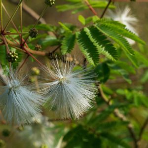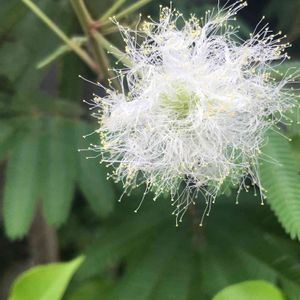 白花合歓木 (シロバナネムノキ) 白くてま~るい形になる前の雄蕊はちじれて 繊細なグラスファイバーの飾りになりますか… 触ってみても髪の毛一本程の感触が有るかなしかで 花はまだ夢の中にいるのかな~