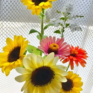 暑さで、せっかく咲いたお花もすぐにチリチリになってしまうので、今度は室内で楽しむことにして、✂️✨ 特にひまわりはチリチリになると、見た目がよろしくないから、この4本は咲いたばかりなので、思い切ってサッサと✂️✂️✂️✂️ ジニアもまだマシなうちにカットして、白いデュランタを添えました😆 この暑さでは、お花たちも綺麗なままでいられないってことですよね😵💫😵💫😵💫🥺🥺 🌻*.゚🍀*゜🌻*.゚🍀*゜🌻*.゚🍀*゜🌻*.゚🍀*゜🌻*.゚🍀*゜🌻*.゚🍀*゜🌻*.゚🍀*゜🌻*.゚🍀*゜🌻*.゚🍀*゜🌻*.゚🍀*゜🌻*.゚🍀*゜🌻*.゚🍀*゜