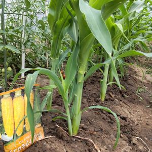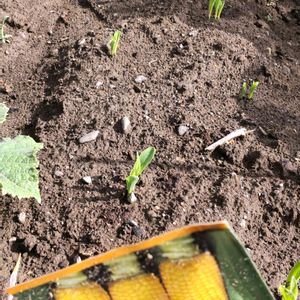 秋採りとうもろこし植え付けました。 今からでも遅くはないとのこと、オータムイエロー、直播き1週間でほぼ芽が出てきました。 鳥につつかれぬ様に、ネットを地面に置いて対処しました。😃☺️