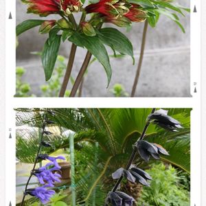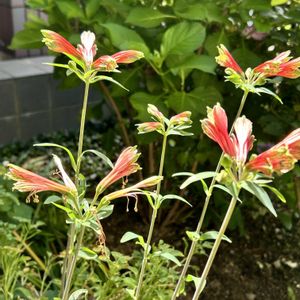 【アルストロメリア・プルケラ 】 ブラジル原産、ユリズイセン科多年草 エキゾチックな赤と緑のコントラストが魅力の原種のアルストロメリア。 5-7月に茎頂に散形花序をだし、長さ3-5cmの赤色の筒状の花を3-9個つける。花被片は赤、紫褐色の斑点があり、頂部は緑色。 草丈:40~50cm 開花期:5月~7月 花色:赤・緑 近所の空き地にて
