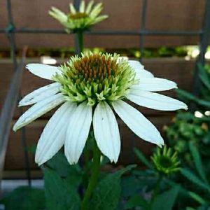 エキナセア・フラダンサーという背の高くなるエキナセアが咲き始めました。 この後花びらが垂れ下がって、風になびくとフラダンスの腰みののように見えるので、その名前が付いたのだと思います。