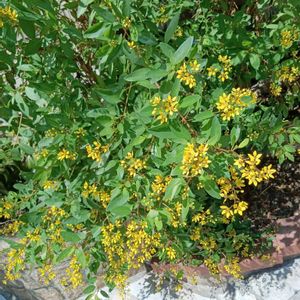 【金虎の尾】《キントラノオ科》 花言葉 「誠実な愛情」「飾らない心」「豪華」 別名 ゴールドシャワー レインオブゴールド 総状花序に直径1–2 cmの黄色い星型の5弁花を次々と咲かせる 花序は長さ5–15 cmほど 花期は6–11月で 開花時は樹全体が 黄金色に包まれ美しい