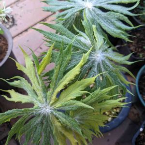 3日間降り続いた雨も ようやくあがりました。 斑入りヤブレガサ こちらは傘を開き始めています(笑) 株が3つに増えて、美しい葉を展開中。