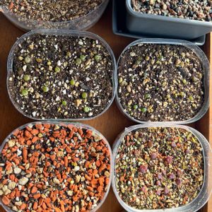 もう完全に種まき中毒です。 この写真の何倍も蒔いちゃってます💦 この写真には写ってませんが、7粒蒔いたプロテアコンパクタの内、種殻からなかなか抜け出せなかった3粒は、抜け出た後程なくしてすぐにお亡くなりに🙏🏻 次に、赤1、黄色1、緑2、の内、緑の色素が濃い2つがお亡くなりに。 赤い色素が濃く出ていた子と黄色い色素が濃く出ていた子が2つだけ生き残っています。 全部発芽したのに、次々お亡くなりになってしまうプロテア。 んな訳で、新たにプロテアマグニフィカを33粒蒔きました。 ぜんぶ生きてちょうだい!