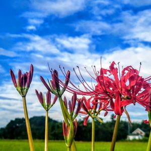 【彼岸花】 ①咲いてます ②ニョキニョキ、アスパラガスの様にでてきましたね。 紅いパイロン置かないと車にひかれます。
