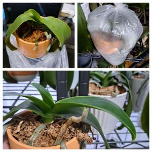 分かるかなぁ😒? ミディ胡蝶蘭だよ💓 ↖️上の葉っぱがダラリ💧 ↗️一週間前に,ビニール袋に入れてふぅふぅ💨 を繰り返してたら😃 下の子💚今日は袋から退院出来そうやでぇ😆😆 葉っぱがシャキッ🌱 頑張ったなぁ🎶