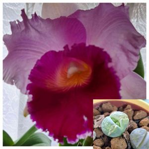 カトレアが咲いたぁ~😍💜🎶 ず~と欲しくて出逢いを待ってたカトレア💜 蕾付きを連れて帰って来て2つも咲いた❗ メッチャ嬉しい🎵😍 存在感バッチリや👍 大事に育てよ🎶 下のリトープス💚 1センチ位の子💚 中に何か入ってる? 植え替え成功や❗ たまらんなぁ❣️