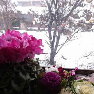 お早うございます❄️ 昨日 夕方からパラパラと雪が舞ってました。 朝目覚めてビックリ‼️ 外は 真っ白になってました❄️❄️ 室内は、シクラメンや葉牡丹が 咲いています🎵 花桃に刺したりんごにも小鳥の姿はありません😢 寒いからかな~🐦