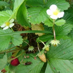 太陽が顔を出してくれたので、草むしりをはじめました🌱 草の中に埋まって、苺畑ではない場所に 白い花と苺がひっそり育ってました☺️ 虫さん達のレストランになってました🍴