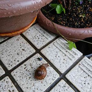 本日、梅雨明けしたと天気予報で言ってましたが⛅ 雷と大粒の雨風で 怖いくらいでした⚡☂️⚡😱☔‼️ 少し小降りになったので、玄関先に出てみると、カタツムリ🐌が、避難していたのか、、、? でて来ていました🐌