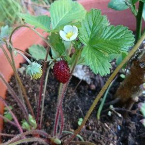 避難させておいた玄関先の鉢物 こぼれ種から大きくなった イチゴちゃん🍓 季節外れの花と真っ赤🍓が 台風一過の朝に嬉しいプレゼントです。 感謝です💕