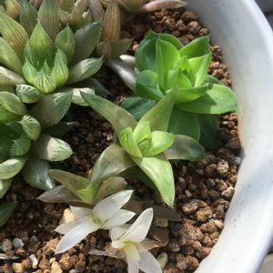 ハオルチア 軟葉系 寄せ植え 先月から更に1ヵ月 京の華錦 全斑の今 右側葉が2枚枯れたけど維持してます。他が成長してるから前回投稿とちがうのがわかるかな🤗