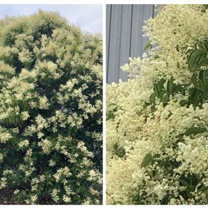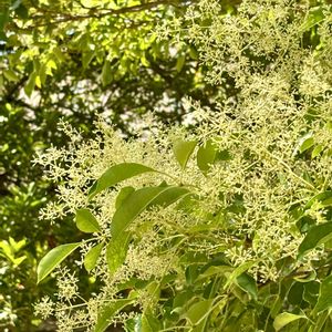 おはようございます😃 今朝の散歩で出会いました。 遠目で、シマトネリコの花かと思いました。 近づいて見ると、違います。 トウネズミモチです。 大きな花房の形がわからない程、枝いっぱいに咲いでいます。 ネズミモチよりも大きい葉っぱ、花数ははるかに多いです。 色も木によって違いがあるようですが、黄色味が強いように思われます。 この花も甘い香りでたくさんの虫🐝🐜達を集めます。 今朝も数匹のアオスジアゲハが飛び回っていました。 距離があって、木の下まで近づくことが出来ず、花をアップで撮ることが出来ませんでした。 最近では、ネズミモチよりもこのトウネズミモチの方をよく見かけます。 植樹されたものでない木もあります。 ネズミモチよりも繁殖力が強いようです。😊