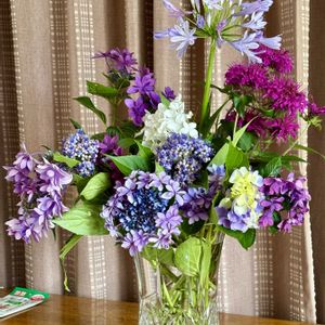 今朝の教会のお花 いろんな色・形のアジサイとアガパンサスとモナルダ(かな?) 色合いがとても綺麗でした。