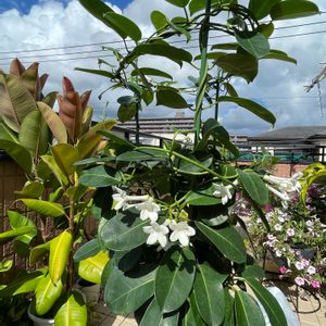 マダガスカルジャスミンの開花😊 良い香りがします❣️ 春にカットして、新芽が5m位伸びた後、咲きました☺️ 3連リングを各3周位回しています。 日本では冬に成長が止まりますが、熱帯雨林🌴だと凄いことになりそうですね😅