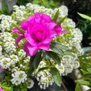 おはようございます🍃 ツツジ 🌸 千重咲き(八重咲き)咲いています🌸🪴🤗🍃🌸🌸 ツツジの後方にスーパーアリッサムがあったので真ん中に入るように撮ってみました 😂 🪴🌸🌸🍃🌸🌳