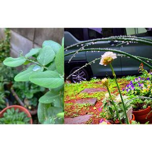 🏷𓈒𓏸︎ 水滴の水曜日 赤エンドウ豆の葉っぱ͛の上に 🫧.*🍃 長〜く伸びてる😆何かの茎にも水滴 💧𓈒𓍯