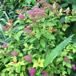 シモツケの花が咲いてきました。葉の色とのコントラストが深みのある華やかさです。