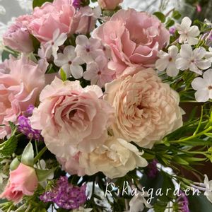 ①②花友さんからコバノランタナをカット✂️していただいたので、庭で今日咲いてた花と飾りました。 ③久しぶりにバラ「ラ マリエ」が小さく花弁少なめですが咲いてくれました。 小さくてもやっぱり可愛い💕 ④アルストロメリアは一本だけの開花です😅 ⑤集めてみると、結構たくさん咲いてくれていてブーケを作る事ができました😃💐