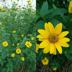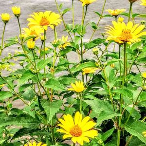 畑花壇です。 小さなヒマワリ🌻のような花がたくさん咲いています。 去年、信州で見たキクイモの花とよく似ています。🤔 調べてみると、キクイモモドキのようです。 葉っぱのつき方が違います。 キクイモの葉は先の方、花の近くでは互生。 それに対して、キクイモモドキは先まで全部、対生です。 はっきり識別できると嬉しいです。😊 やはり、都市部ではキクイモは少ないでしょうか?