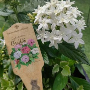 𓈒𓏸❁⃘ ペンタス グラフィティ 暑いと白いお花が欲しくなります🥰 家にあるリーフを使って、グリーンとホワイトの爽やかな寄せ植えとしました😆🎶 タカザワフラワーファームさんのお花💠 タグがおしゃれ💗 猫好きの心を鷲掴みー😻 タカザワフラワーファームさんのお花にタグを添えてUPされているpicを見たので真似っこ( *´艸`) 真似しちゃってごめんねー😅