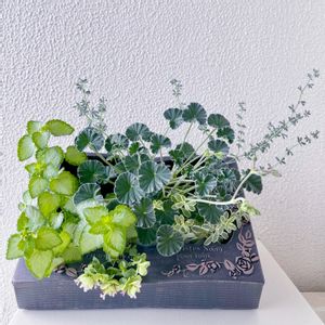 挿し木で作った葉っぱ好きの寄せ植え。 花がなくとも可愛くて可愛くて… 色んな緑のトーンが好きです。 花も咲き始めています。 先ずはオレガノ。ラミウムにペラルゴニウムも花芽が上がってきています。