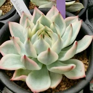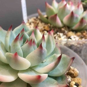 おはようございます!😊 トロピカルガーデンさん、エケベリア祭りNo.2😁 今日のpicは、福袋ではなく、個別のものです。 左手前から イードンスノー(プレゼント) ルノーディーン😍 カリビアンブルー 左後ろから シンデレラ✨ オンスロー(プレゼント) チワワエンシス錦 です。 まず、カリビアンブルーを手に取り、その後、名前に惹かれシンデレラを💕 シンデレラなんて、多肉があるのは知りませんでした。😍 3000円以上で、多肉一つプレゼントでしたので、オンスローをいただきました。 その後、ルノーディーンが気になって、、、 ずっと、欲しかったので💕 でも、予定外でしたので一旦帰宅しました。 家に帰って、長男にルノーディーンがあったと話すと買って来いよ!と言われ😁 後押ししてもらい、再び、戻りました。 一つ、ルノーディーンが残っていて、こちらは、単品ではなく2個で購入となっていたので、チワワエンシス錦を選びました。(だいぶ迷いました😅) また、プレゼントようのイードンスノーをいただきました。 多肉ちゃん達をみては、心満たされています。😄
