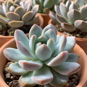 エケベリア属 ラウリンゼ🌱 お粉をまとって先っちょピンクが可愛い😍 天気予報と違って晴れ☀️て日中は30度超え💦風があって涼しいので全ての多肉にオルトラン蒔きました😆