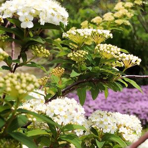 コデマリ 寒暖差のせいか、我が家の庭のコデマリはまだ満開に遠い。 背景のピンクは今が満開のクリーピングタイム。
