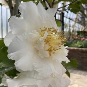 《ツバキ・エレガンスシャンペーン》 デンパークコレクション🌼 エレガンススプレンダーの枝替わり品種🌼🤭 花弁も葉も縁取りがギザギザの鋸状に🤭 白色の八重咲で、牡丹咲き~大唐子咲になります。中輪~大輪。
