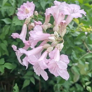 ピンクノウゼンカズラ 優しいピンクの花びらの花を咲かせる。 オレンジのノウゼンカズラと比べるとかなり小ぶり。