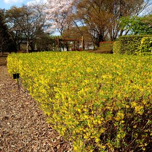 生け垣にしたら幸せになりそうですね🤩 いつもの散歩コースも、今日のテーマ「レンギョウ」が黄色い世界をつくり出していました🙌(農業試験場内にて)
