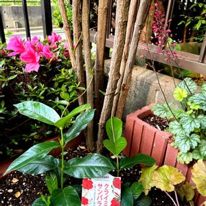 クライミングサンパラソル大輪系レッドの春の植え替え④11月〜4月15日まで玄関内で管理③今年の植え付け場所②露地植え完了①昨年8月🌺今年の開花が楽しみ😊