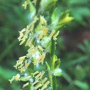 皆様、今日も1日おつかれさまでした。おととい土手で取ってきてトイレに飾った「ホソムギ」飾った時にはなかった黄色い花がチョロチョロと… 気になったので撮りました😃