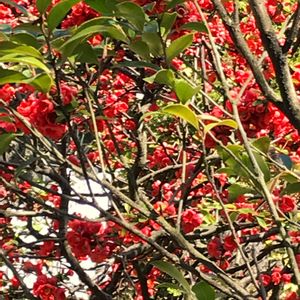 こんにちは☀️ 侍JAPAN、世界一 おめでとうございます🎉で気持ちよく散歩に行こうとしたら隣りの庭に 今日の花、真っ赤なボケの花が見えたので思わず📸🏷隣のはな