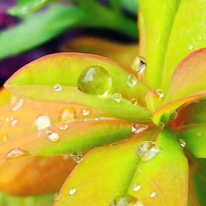 寄せ植えのカラーリーフ 日当たり悪かったかな。 もう少し紅葉するはずだったのに、ごめんなさい。 「雫をのせて綺麗だよ」って声かけて、アップで撮影。