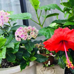 雨のテラスの鉢植え☔️ こんな組み合わせで咲きました🌺 しばらく雨が続きますね