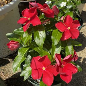昨年救済苗で購入したサンパラソル ①スカーレット 余り剪定せずに冬越しした 春に5号から6号に鉢増し ②クライミング大レッド 春に5号から8号鉢増しした為根腐れが怖くて水を少なくしたら葉焼けして成長が遅かった。 水やりを増やしたら最近調子良くなった😀 ③クリアホワイト 5号鉢 購入時状態が悪く、昨年数輪咲いたが株が大きくならず根も張って無かった💦鉢増しせずに育ててるが大きくならない😢 ④スカーレット挿し木2苗 8号鉢 これが1番調子良さそう🎶 花も沢山付いてる、実家の軒下半日陰に置かせて貰ってる😀