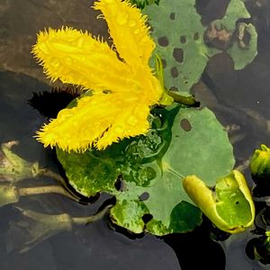 アサザ(浅沙) 別名 イヌジュンサイ.ハナジュンサイ *ミツガシワ科アサザ属 花期は6〜9月 本州〜九州の水路や水深の浅い池や沼に生える多年草の水草! 茎から長い葉柄を伸ばして水面を覆うように葉を浮かべる浮葉植物! 葉は卵形〜円形で基部は深く切れ込み縁に浅い鋸歯! 花は朝に咲いて午後には萎んでしまう黄金色の1日花! 異形花柱花ですが雨、そして午後でしたからハッキリと見えませんでした❗️ 少なくなっているそうですが、この場所は保護されている訳でも無くたくさん咲いていました♪ 環境省.準絶滅危惧種(NT) 9月4日撮影 宮城県登米市