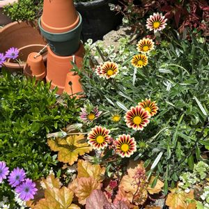 こんにちは😊 ① ガザニアが咲いてきました 花壇植えですが貧弱な土なのでこのくらいが満開かな〜( ´д`)💨 ②③ 奥の紫の花 昨年お迎えのベロニカ ハミングバード ④ 挿し芽のビオラ 小さいポットでまだまだ元気!!