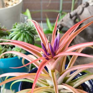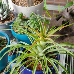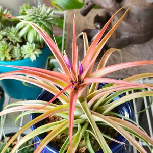 さっそく飾ってみた🪴 チランジアガーデンさんで購入したイオナンタフエゴはお花が咲いた後だったらしい🌸花柄を発見💡 子株が何個か吹いてきてる🌱ので育てたいなってちょっとこの暑さでお水が欲しそうかも🫗 蒸らし気味のカピタータはちょっと我慢かな😣? DAISO産フエゴっぽいやつはなんだか白っぽいのでお日様に当て中☀️です