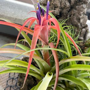 チランジア カピタータ ピーチです。 鉢植えのイエローストロベリーグァバの根本が苔むしているので、エアープランツやリピサリスを着生させてます。