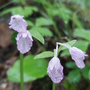 カモメラン(鴎蘭) ラン科カモメラン属の多年草 入笠山では入笠山の希少種「イチヨウラン」を守り、山野草公園で育つ株の保護・再生が行われていますが 今年は保護柵内にカモメランも数株咲いていました♪ 遠くに咲いているのでコンデジで、やっとこれだけ見られました♪ ・広楕円形の葉を1枚つける。 その付け根から花茎を伸ばし2~3個の淡桃色の花をつる。 ・唇弁には一面に紅紫色の斑紋があり浅く3裂するが目立たない。 ・距は線形 ・条件が良ければ栄養繁殖するので群落を作ることがあるそうです。この場所で群落も夢ではないかもしれませんね〜 📷 2024/6/5 入笠山