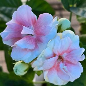 こんにちは〜! 八重咲きゼラニウムロザリア の寄せ植えです。 バラのように咲くゼラニウム、 かわいいです🥰 シンプルな白いゼラニウムも いっしょに寄せました。 手前に星空マムとまだ咲いてないけど カリブラコアピーチキャンディ💕 満開になったら、すごくかわいい と思うけど🥰