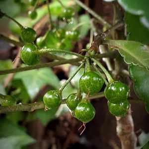 はいはーい 秋祭りだよぉ~ ☝寄ってらっしゃい❣️ 見てらっしゃい❣️☝️ マンリョウ飴🍏はいかがかな? 赤くなるまで 待つかい⁉️ そこの 鳥さん。 🥴🤭😅葛飾柴又の寅さんかーい 鳩🕊さんの置き土産です。 3~4年で、背丈5~60㌢に。 マンリョウの実(実5㍉強) うっすら、雨がおおってて ツヤツヤ。ソバカスが可愛い🍏