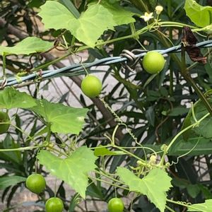 可愛い葉っぱ🍀にまん丸の緑の実🟢 鉄線に巻き付いていました。 上の方に小さな花が咲いています🤍💚 今わかりました! 「スズメウリ」のようです♪ 葉が枯れた後の白い実は見たことがありますが、こんなにたくさんの緑の葉と実を見たのは初めてで、わかりませんでした。 🏷ちっちゃいものクラブ に参加させていただきます。 雌雄同株の雌雄異花 この花は雄花のようです。 ウリ科 スズメウリ属 花期: 9月 結実期: 10〜11月(直径1〜2㎝熟すと灰白色)