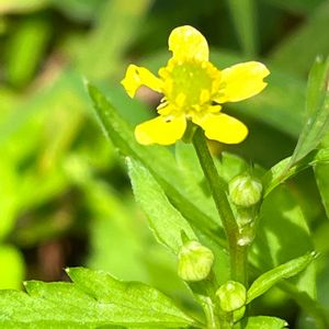 これは上部の葉が腺状なのでウマノアシガタでしょうか? ♡かし様にキツネノボタンと教えていただきました ♢下の二枚の花弁の間にそり返る萼片が見えます ※キンポウゲ科キンポウゲ属 7/2撮影 北海道から九州まで分布 草丈30〜50cm 根生葉は葉柄が長く3出複葉 小葉は卵形で切れ込みが入って2〜3裂 茎生葉は上にいくほど柄が短く互生 キツネノボタンは萼片がそり返りウマノアシガタは反り返らないようです 花期5〜7月 黄色の5弁花で光沢あり 花後に金平糖のような果実が付く