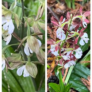 右が自生のエビネです 奥にもまだお花を付けないのがみえます(実家の土地に自生) 左は自生のを移植したものです(実家の土地から) 本来は右側もありましたがお出かけ中に盗掘されてしまいました どちらも癒されるお花です ※ラン科エビネ属 北海道南西部から沖縄まで分布 葉は2、3枚付き薄く超楕円形から倒卵状披針形、縦に5本の脈あり 花期4〜5月 多数の花を横向きに平開する