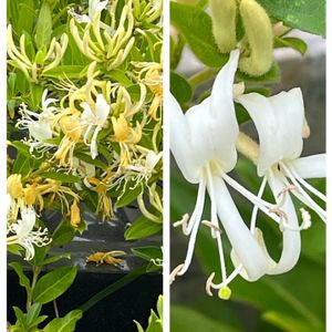 咲き始めのお花は白色で受粉前の柱頭は丸い緑色が右側の写真に写っていましたのでご覧ください 🏷️今日のお花 ※スイカズラ科スイカズラ属 常緑または半常緑のつる性木本 北海道南部から九州まで分布 葉はつるに対生し葉身は卵形から楕円形、長楕円形 葉の暑さは季節で変化あり冬季は厚めになる 花期 5〜7月 葉縁から2個ずつ並んで咲く 夕方から甘い香りが漂う 咲き始めは白色、受粉すると徐々に黄色になり花弁は細い筒状で漏斗形の花冠