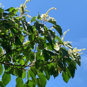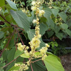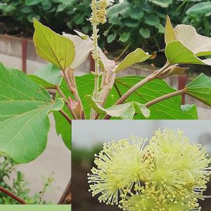 ②いい香りがするので上を見上げたら…✨ 多分、アカメガシワの雄花🤔 高さ15m、直径50cmに達する。葉は互生。葉身は長さ7〜20cm、幅5〜14cmの卵形または広卵形。ふちは全縁または波打ち、ときに浅く3裂する。